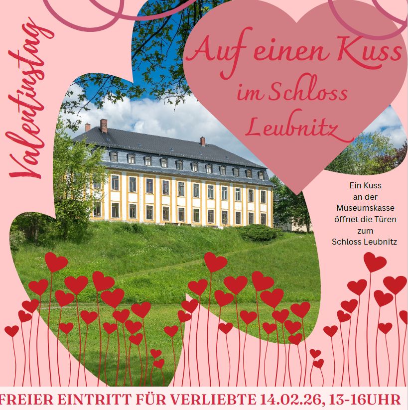 Der Förderverein Schloss Leubnitz feiert den Tag der Liebenden. Denn alle Paare, die sich an der Kasse mit einem kleinen Kuss die Liebe gestehen, dürfen die Ausstellungen am 14.12.26, zwischen 13-16 Uhr kostenlos besuchen.